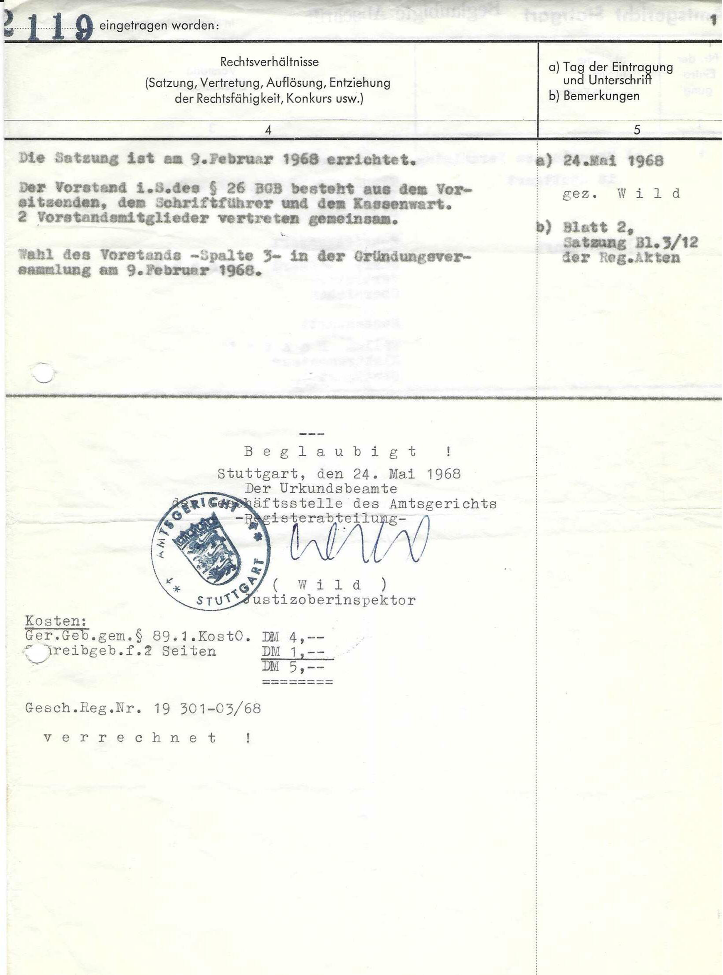 In de 60-er jaren bleek dat de vereniging niet officieel was opgericht en in het ambtelijke Vereinsregister van de stad Stuttgart was geregistreerd.
