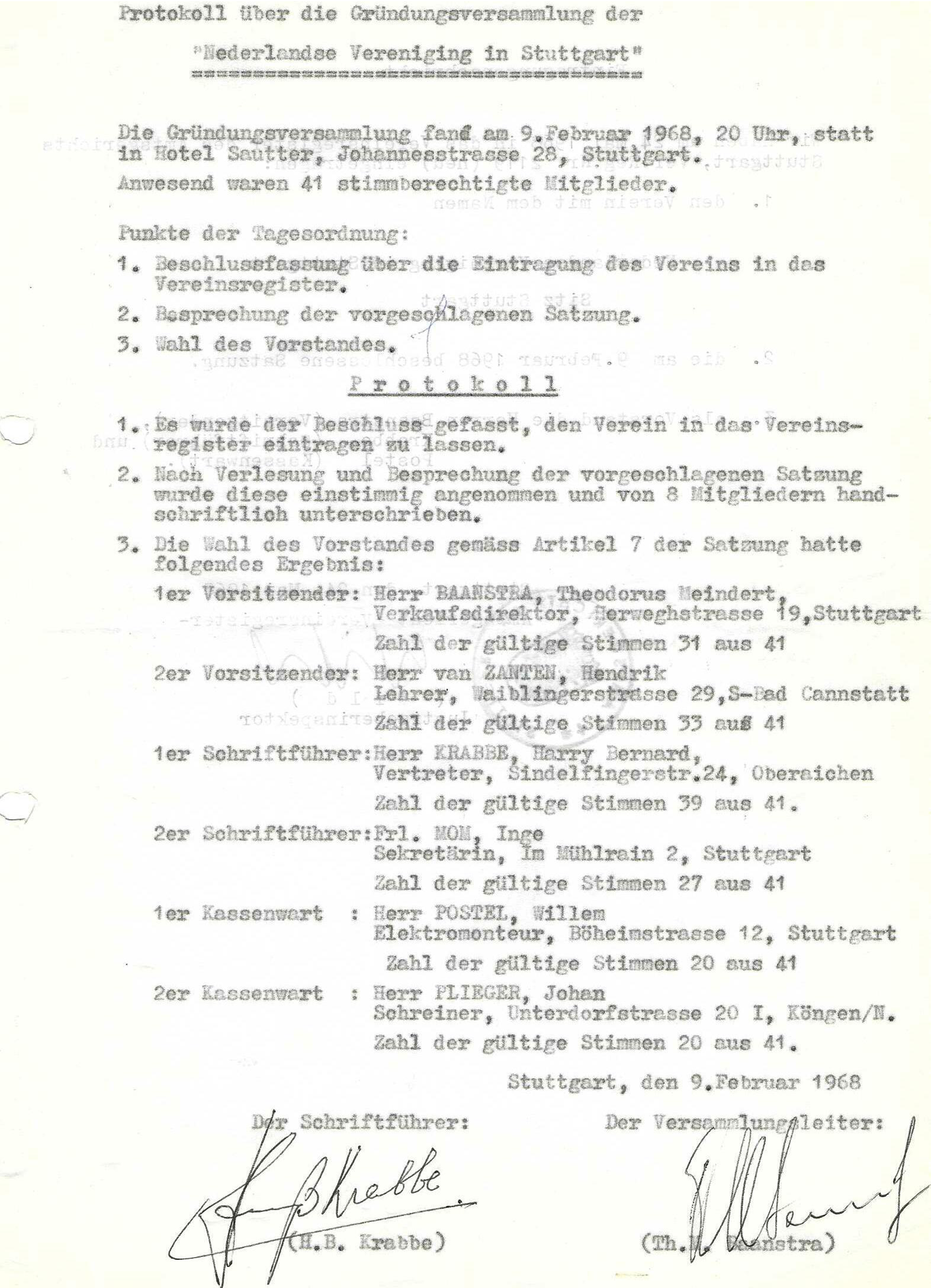 Op 24 mei 1968 werd de Nederlandse Vereniging in Stuttgart officieel in het Vereinsregister van de stad Stuttgart opgenomen.